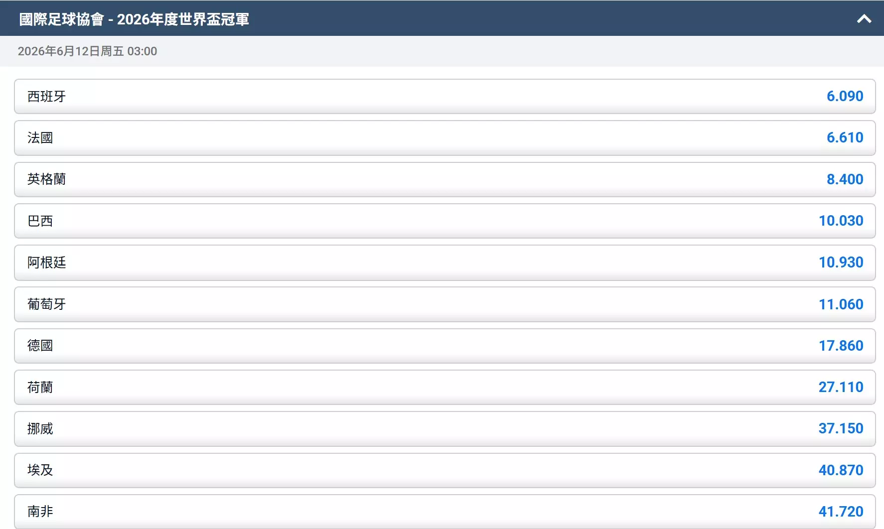 ( 註:賠率隨時會變動,僅供參考,請以各家正式公告為準。 )