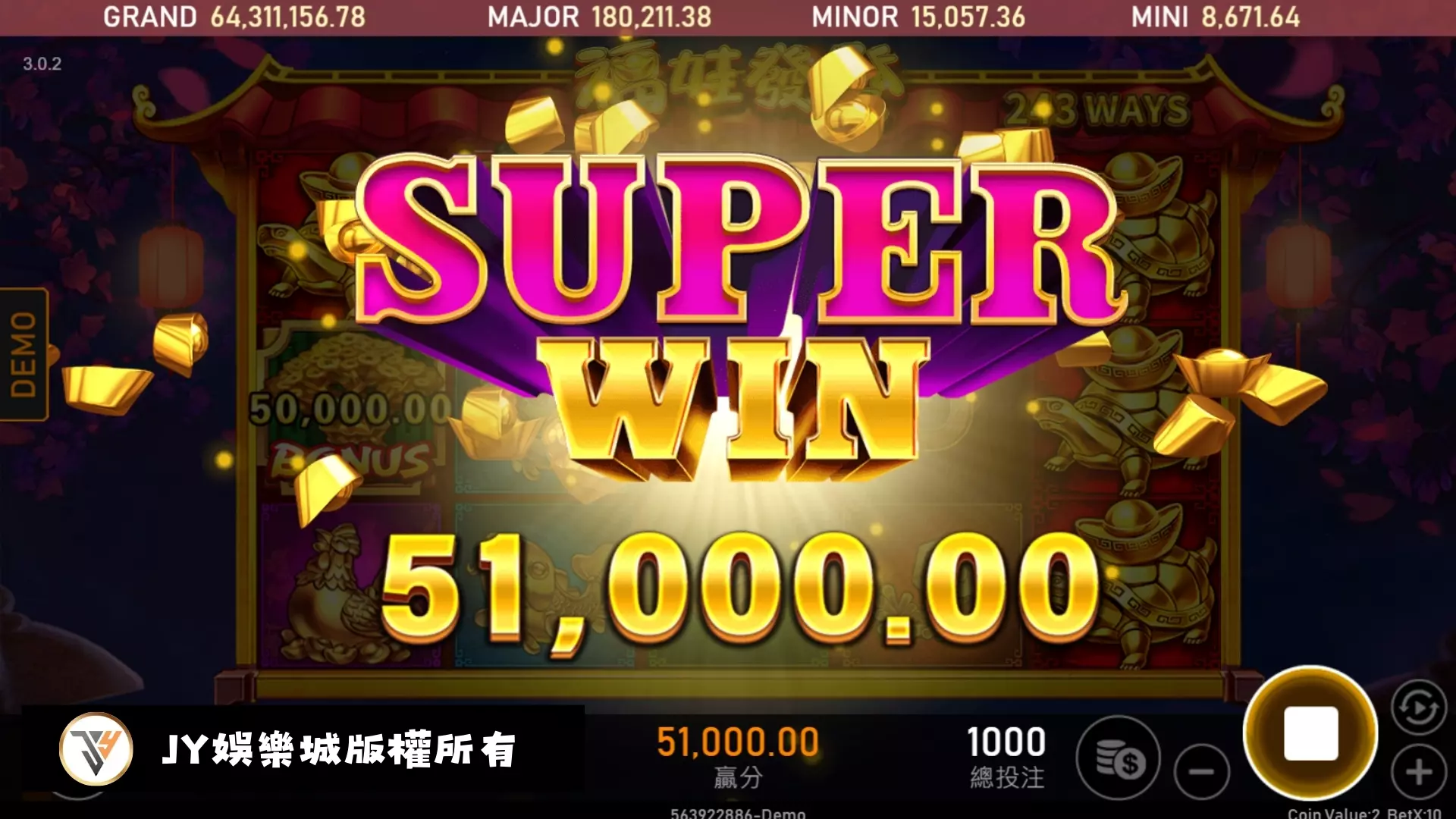 那進入有請財神遊戲,你將有機會獲得三種不同的彩金,分別為「Grand」「Mega」「Mini」。玩家能夠隨時查看遊戲中累積的金額,而每次達成JP彩金中獎,玩家都有機會獲得整個獎金池的豐厚獎金。此外,累積獎金還會觸發黃金雨功能,進一步增加獎金贏取的樂趣。